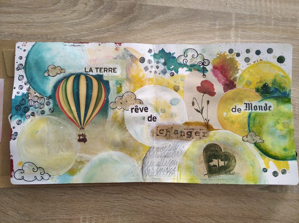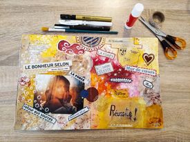 Durant l’atelier, nous allons construire et créer la page étape par étape. Les couches vont venir se superposer pour donner de la profondeur. Poser une thématique, construire le fond puis partir en exploration de couleurs, de textures, de formes, de mots, pour au final se laisser porter par le « flow créatif ».