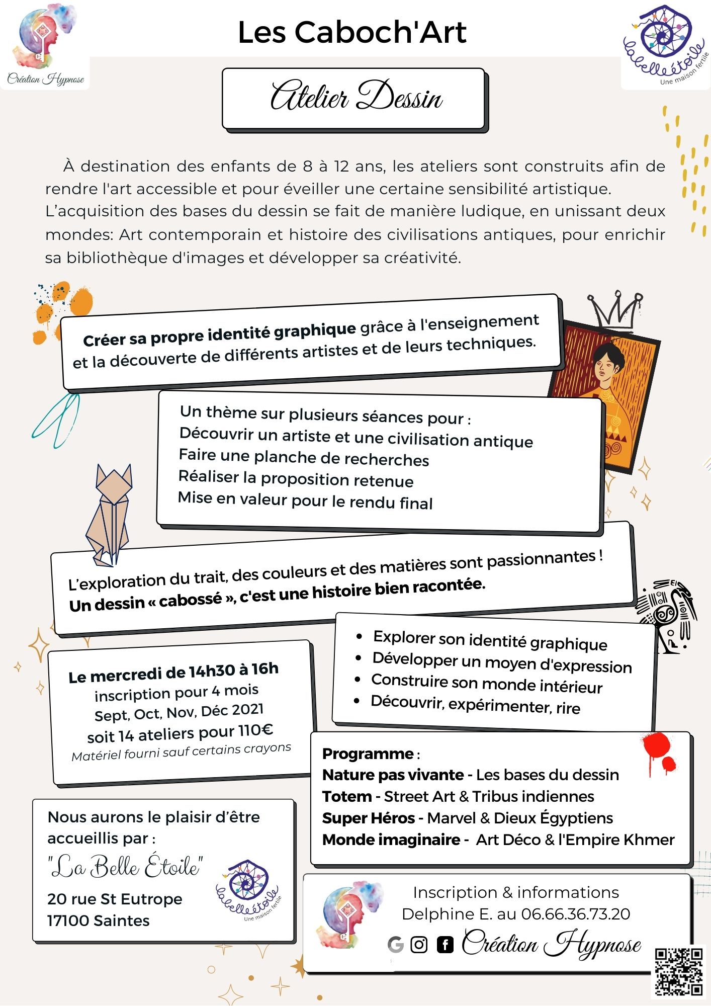 À destination des enfants de 8 à 12 ans, cet atelier est construit afin de rendre l’art accessible et pour éveiller une certaine sensibilité artistique. L’acquisition des bases du dessin se fait de manière ludique, en unissant deux mondes : Art contemporain et Histoire des civilisations antiques, pour enrichir sa bibliothèque d’images et développer sa créativité.